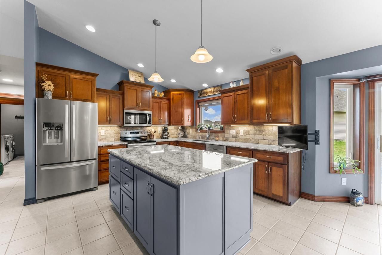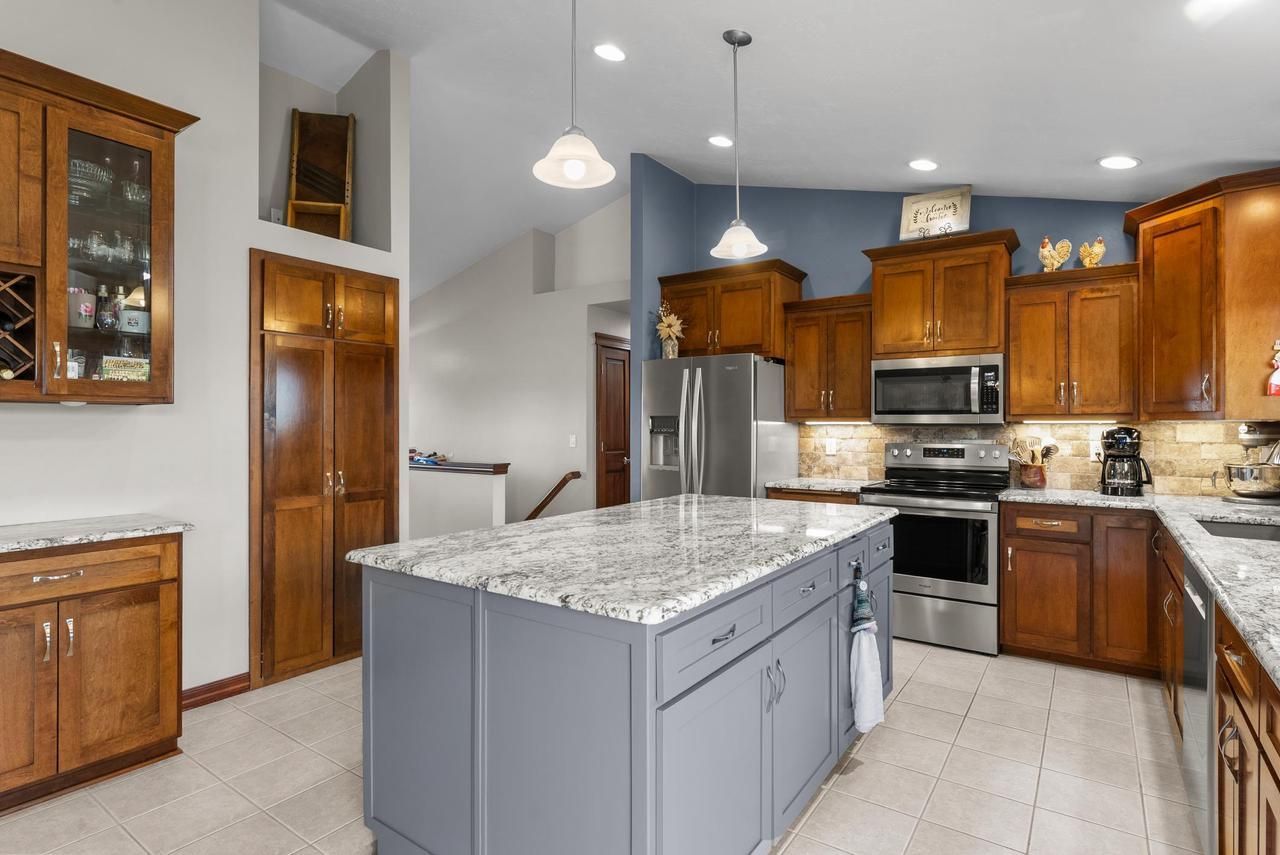 This 3 BR home features 2 full and 2 half baths, and a stunning remodeled kitchen as its centerpiece. The kitchen features; GRANITE counters, tile backsplash, custom cabinetry w/pullouts in the LARGE island, new wine rack/hutch with a coffee counter, under-cabinet lighting, newer appliances, and tile flooring. Additional features of the home include: Living room with a beautiful gas FP, dining area w/patio door leading to a 16 x 14 deck, updated carpeting and paint throughout. The primary suite with a tray ceiling offers a private bath with a step-in shower, and a spacious walk-in closet. First-floor laundry. Fantastic, 28 x 12, rec room and 12 x 10 game area, plus an unfinished workout area featuring a SAUNA! Heated, insulated, drywalled 3-car garage w/epoxy floor. Worth your look!