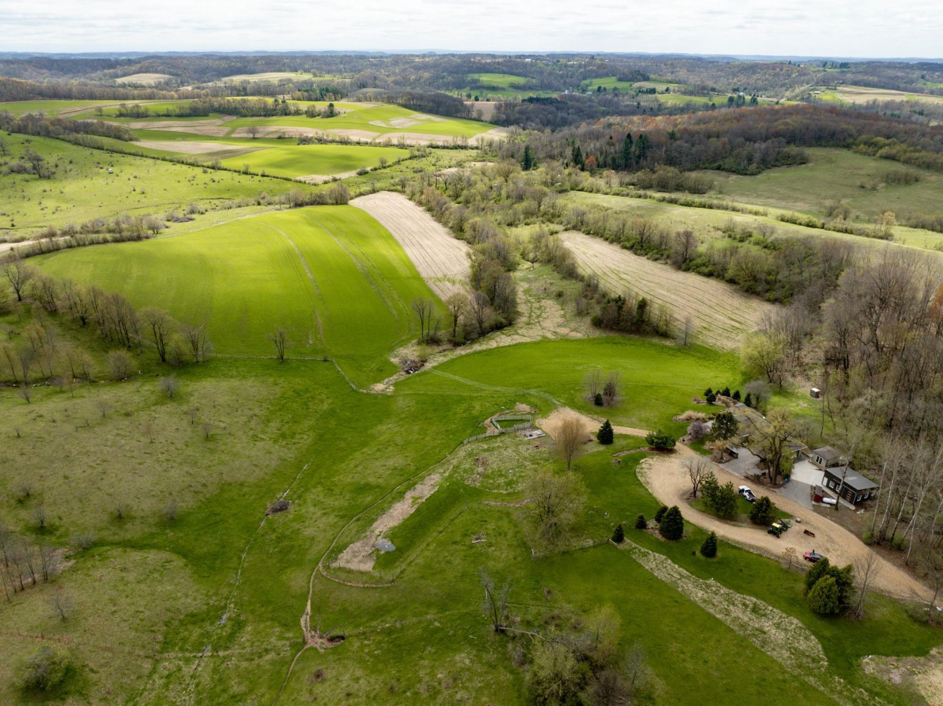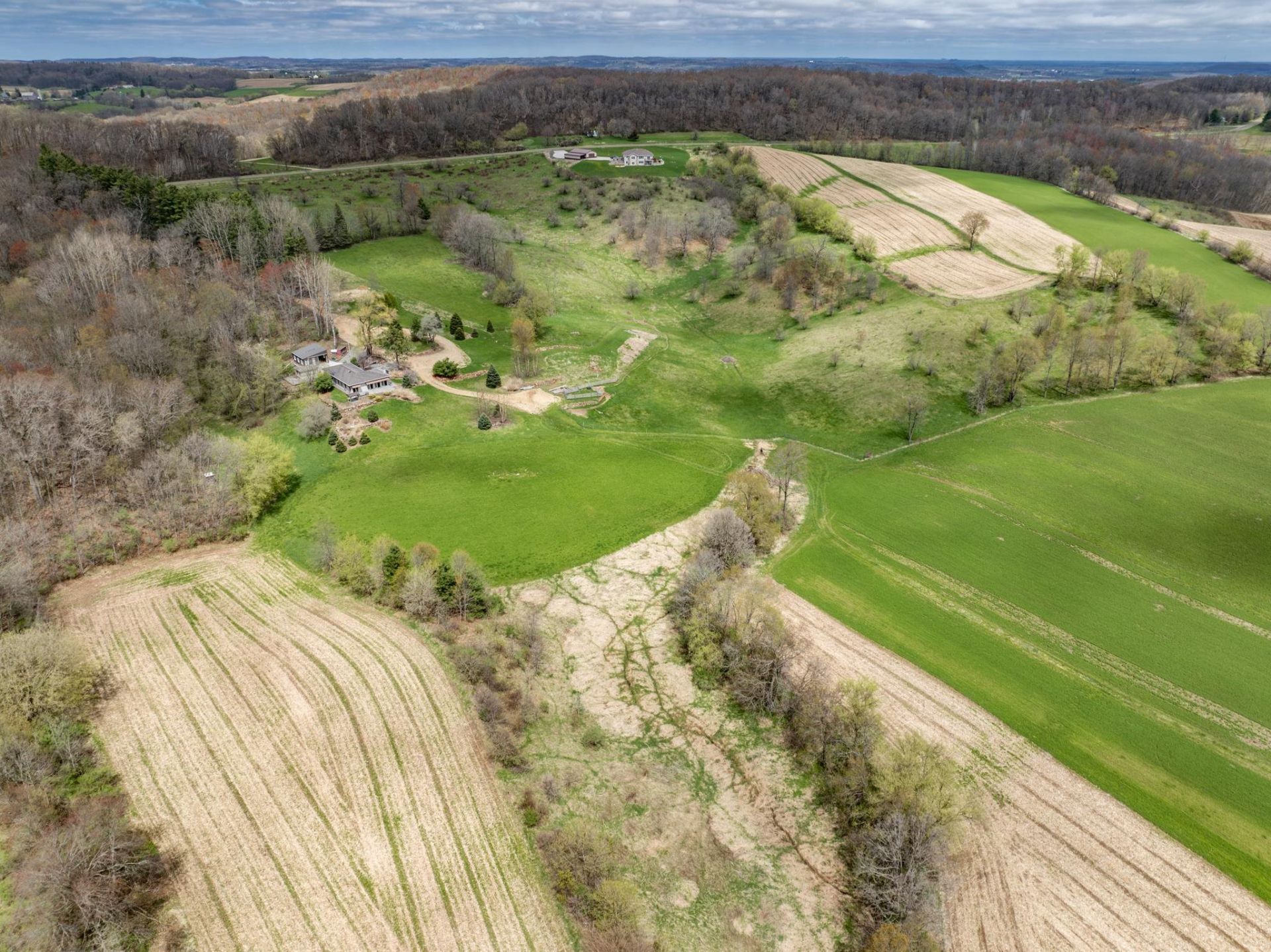 Tucked into the scenic hills and valleys of southern Juneau County! 58 beautiful acres with a home that features 1 bedroom and 2 full baths, in-floor heat, a cozy woodburning fireplace, and impressive 10' ceilings that create an open, airy feel. The kitchen is equipped with solid oak cabinetry, Corian countertops, and stainless-steel appliances. Primary bath includes a luxurious steam shower. Outside, you'll find exceptional versatility with a 1.5-car garage that includes a dedicated work area and a convenient Vevor automatic door leading directly into the home. Additional outbuildings include a 25x28 detached shed with electric and gravel floor, plus a 13x18 building for extra storage or hobby use. RV-ready with water, sewer, and electric hookups. Enjoy the outdoors from the large deck with wire railings or the spacious patio, all surrounded by striking terrain featuring rolling hills, natural rock formations, and sloping landscapes that offer both privacy and character. Rare find!